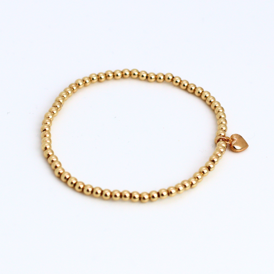 We're obsessed with this darling charm bracelet! The bubble heart is 14K gold, and hangs beautifully from the 3mm gold filled bead bracelet. Made for everyday living, which means you can sleep, shower and sweat in it. Hand beaded in the USA on high performance elastic for a slight stretch to easily roll on and off your wrist.