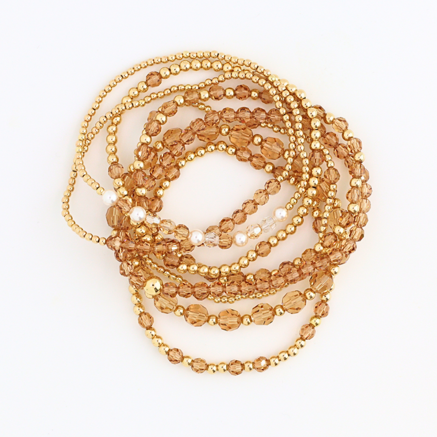 A timeless bracelet with a warm, golden glow. The Classic 3 mm Light Colorado Topaz pairs delicate 3 mm 14 kt gold-filled beads with sparkling Swarovski crystals in light Colorado Topaz—a soft amber hue that radiates warmth and elegance. Hand-beaded in the USA, this piece is designed for effortless everyday wear, whether layered into your Legacy Bead stack or worn solo for a touch of golden light.