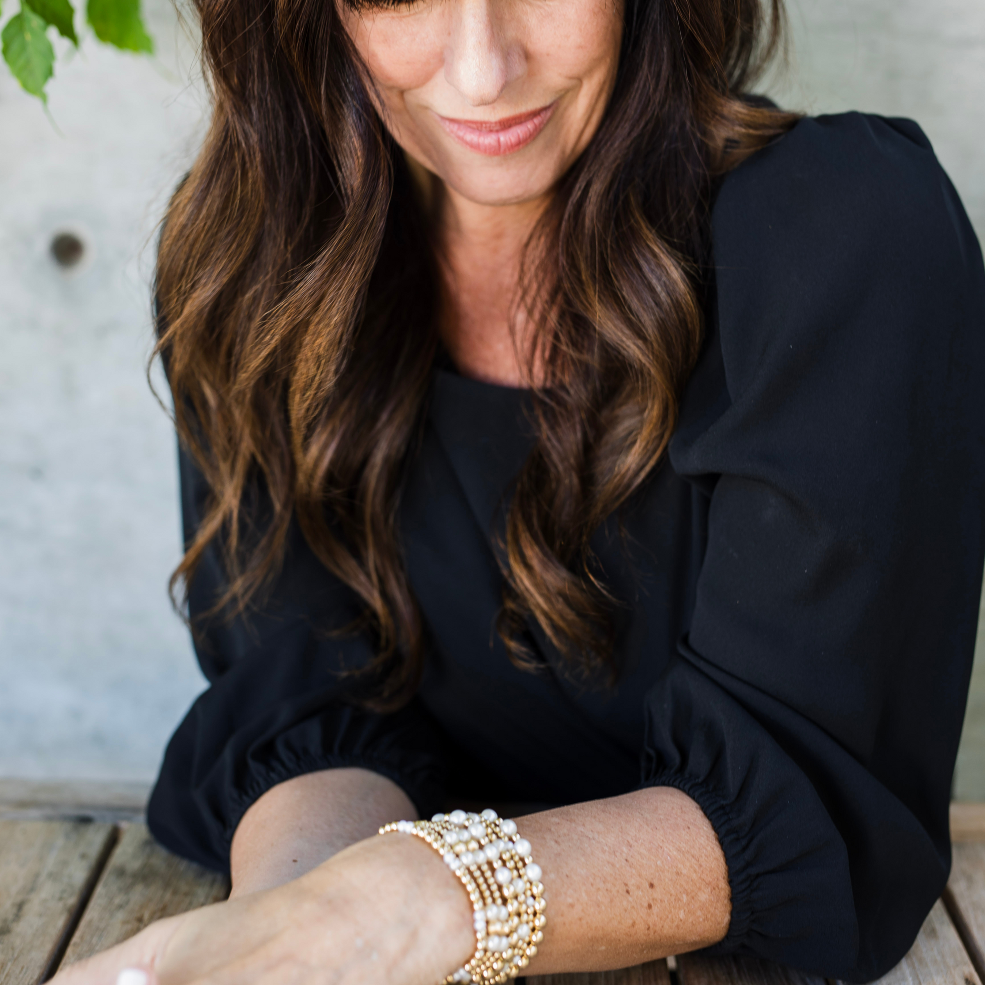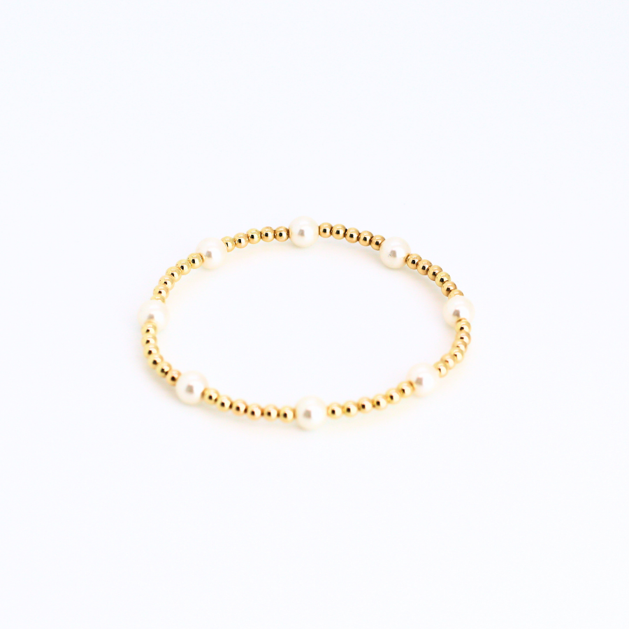 Our Classic patterned go-to bracelet made with 3mm, 14kt gold-filled beads, and 6mm pearls. Made for everyday living, which means sleep, shower and sweat in it. Hand beaded in the USA on high performance elastic for a slight stretch to easily roll on and off your wrist.