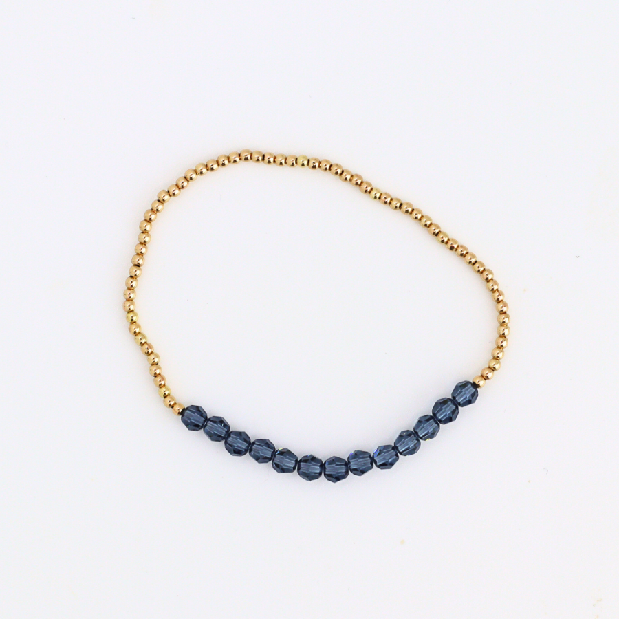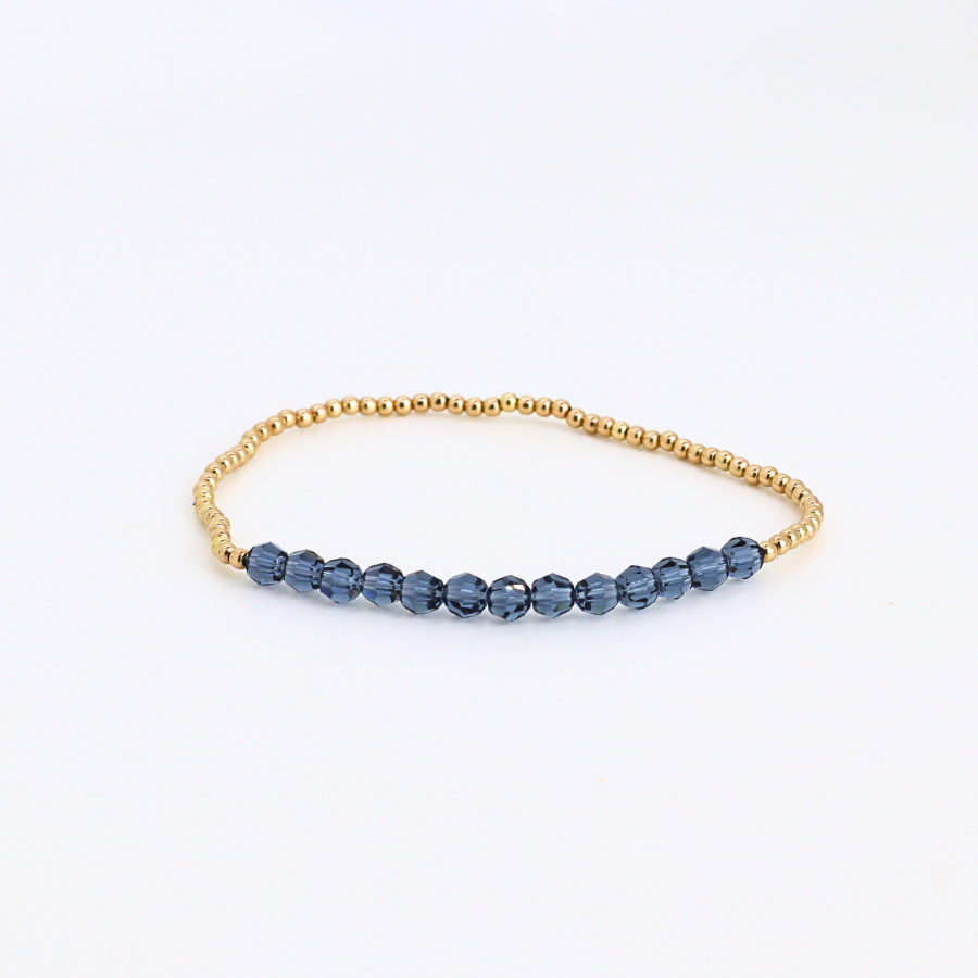 Made with 2 mm 14 kt gold-filled beads and 4 mm Swarovski crystals in light denim
