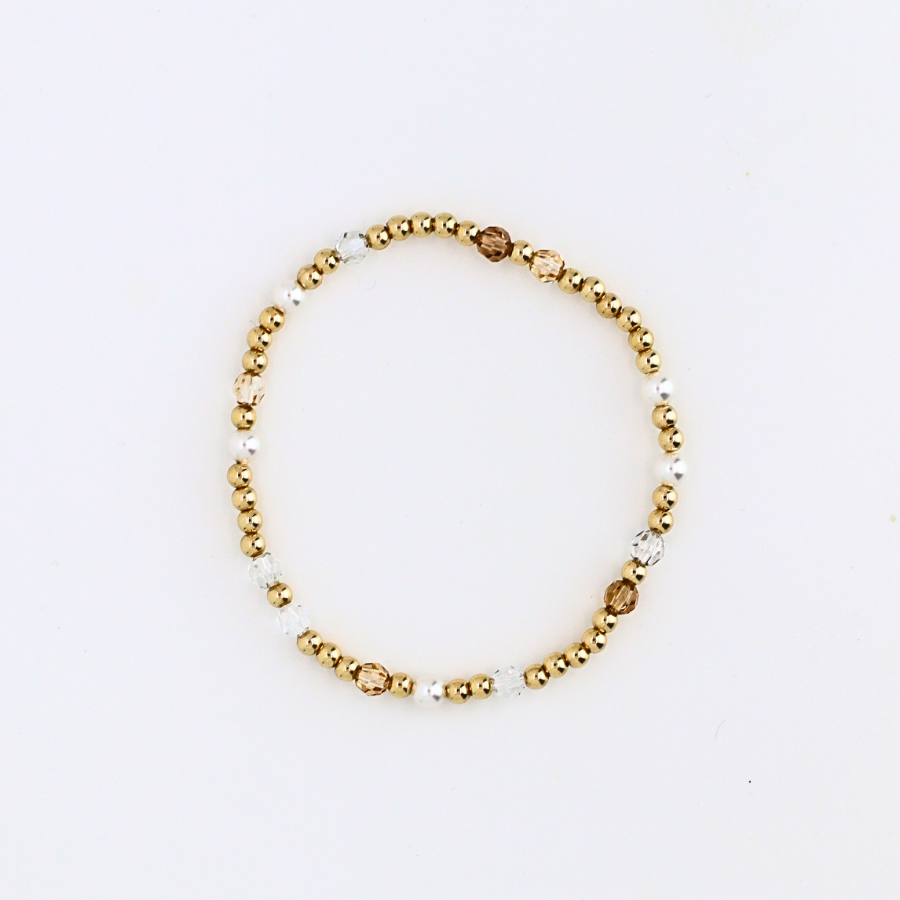 Made with 4mm Swarovski crystals in amber tones, luminous pearls, and 3mm 14kt gold-filled beads