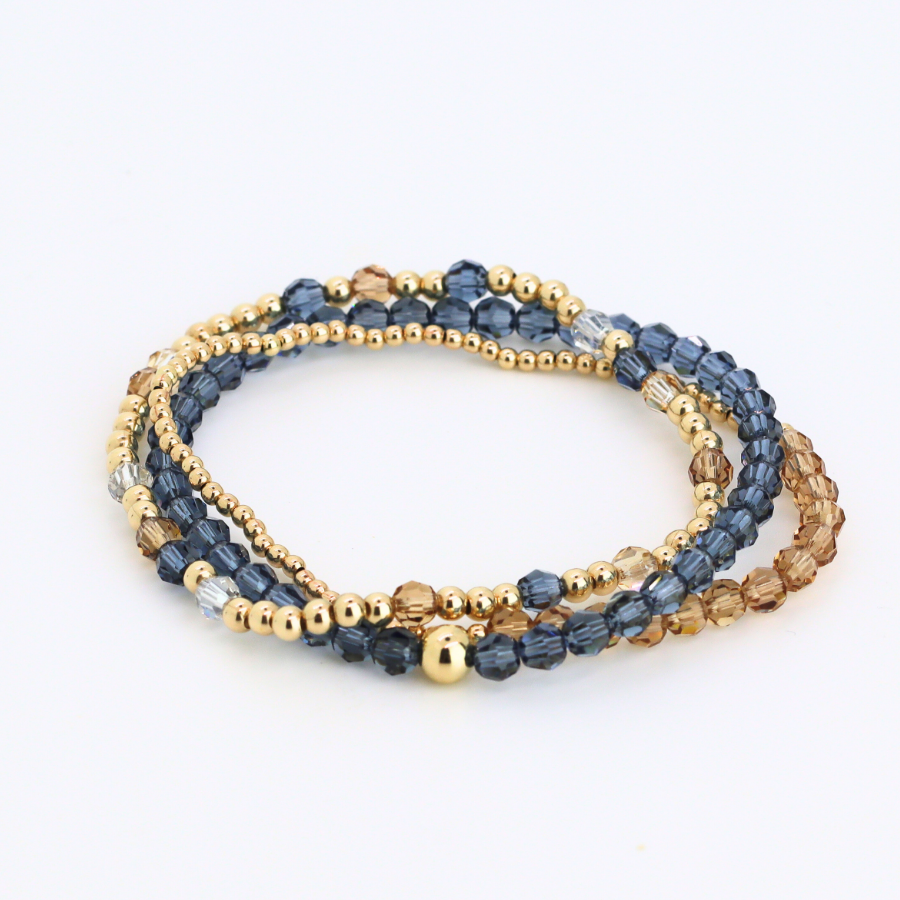 Made with 4mm Swarovski crystals in amber tones, light denim, and 3mm 14kt gold-filled beads