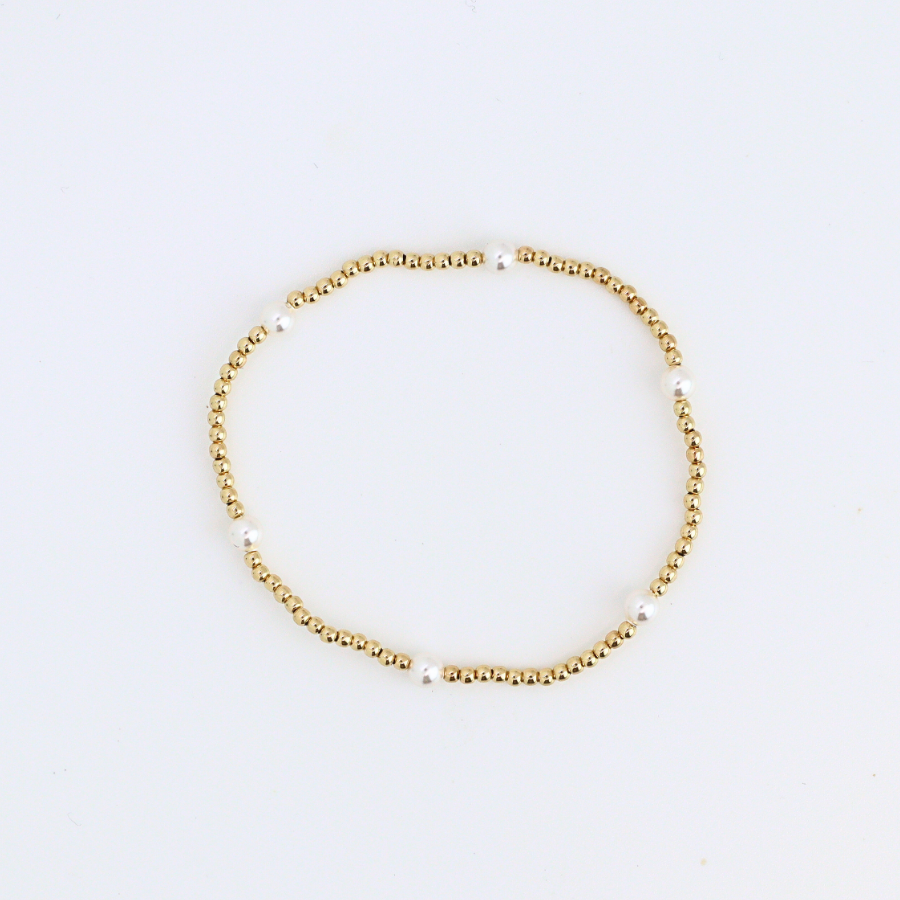 Classic and luminous, the Pearl Luxe bracelet pairs 4mm luminous pearls with delicate 2mm 14 kt gold-filled beads for a refined balance of elegance and everyday wearability. Hand-beaded in the USA, this elevated design shines on its own or stacks seamlessly with the entire Lux Line for a curated, luxurious look.